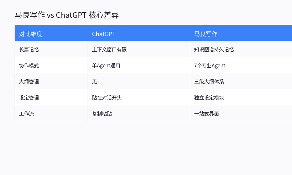 从知识图谱、多Agent协作、大纲管理、长篇记忆四个维度,深度对比马良写作和ChatGPT在小说创作上的实际表现差异。